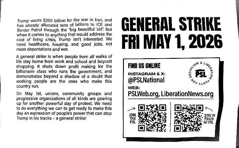 Upon further investigation, the PSL within St. Louis are handing out pamphlets across the city within the weeks leading up to this “general strike.” It mostly takes aim at the Trump administration on the grounds that he is bad for “the people” (whoever they’re supposed to be) and that the war in Iran is illegal (as if a “legal” war would be better). Here are some choice excerpts regarding this “general strike:”